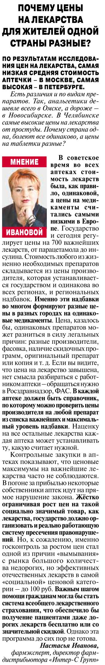 В советское время в аптеках разных городов стоимость лекарств была, как правило, одинаковой, а цены на медикаменты считались самыми низкими в Европе. Государство и сегодня регулирует цены на 700 важнейших лекарств, от парацетамола до инсулина. Стоимость любого из таких жизненно-необходимых препаратов складывается из цены производителя, которая устанавливается государством и одинакова во всех регионах, и региональных надбавок. Именно эти надбавки во многом формируют разные цены в разных городах на одинаковые медикаменты. Цена, казалось бы, одинаковых препаратов может разниться и в силу легальных причин: разные производители, фасовка, наличие скидочных программ, оригинальный препарат или копия и т.д. Если вы видите, что цена на лекарство завышена, нет смысла разбираться с работником аптеки – обращаться нужно в Росздравнадзор, ФАС. В каждой аптеке должен быть справочник, по которому можно проверить цены производителя на любой препарат из списка важнейших и максимальный уровень надбавки. Наценку на все другие лекарства каждая аптека может устанавливать ту, какую считает нужной. Контрольные закупки в аптеках показывают, что ценовые максимумы на важнейшие лекарства часто не соблюдаются. В погоне за прибылью некоторые собственники аптек идут на прямое нарушение закона. Жестко ограничивая рост цен на такой социально-значимый товар, как лекарства, государство должно организовать и реально работающую систему пресечения правонарушений. Но, к сожалению, именно госконтроль за ростом цен стал одной из причин «вымывания» с рынка большого количества недорогих, но эффективных отечественных лекарств в самой «социальной» ценовой категории - до 100 руб. Важным шагом помощи гражданам могла бы стать система всеобщего лекарственного страхования, что обеспечило бы получение пациентами даже дорогих лекарств бесплатно или со значительной скидкой. Однако эта программа до сих пор не готова.