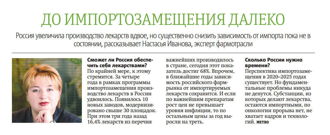 – Перспектива импортозамещения в фармотрасли к 2020-2025 годам существует, хотя ряд фундаментальных проблем останется: необходимо с нуля восстанавливать производство фармсубстанций (сейчас для производства отечественных лекарств используются импортные субстанции, что существенно влияет на их стоимость), в производстве препаратов для лечения онкологических или генетических заболеваний в ближайшее десятилетие отечественные производители достигнуть успеха не смогут. Производство относительно недорогих дженериков зарубежных препаратов на основе готовых импортных субстанций – это пока единственный локомотив процесса импортозамещения в российской фармотрасли. Есть и иные проблемы на пути к «глобальному импортозамещению», которые необходимо решать: непостоянство регулятивной среды, отсутствие достаточного количества высокопрофессиональных кадров, минимальное количество отечественных инноваций и технологий.